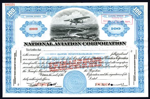 New York, ND (ca. 1930's), Specimen Stock, 100 Shares, Black on light blue border and underprint, Prop plane top center flying over farm and river, Red overprint stating change in the stocks par value in center, VF-XF condition, ABNC.