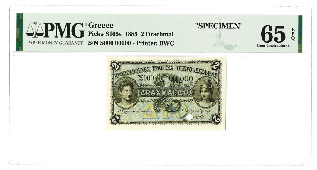 Greece. 2 Drachmai, 1885, P-S105s Specimen banknote. PMG graded Gem Uncirculated 65 EPQ (Cert # 8072406-031). BWC. Tied with one other as highest graded out of 3 listed in the PMG census.