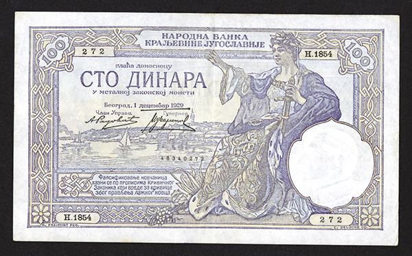Yugoslavia. 100 Dinara. SCWPM 27b. Seated female with sword at right. Center fold, Very Fine+.