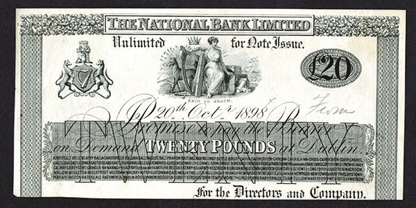 Ireland. National Bank Ltd. 20 Pounds, 20.10.1898. SCWPM #207p. Bold black print uniface proof with pencil notations, cut above signature line. Formerly mounted. Very Fine or better.