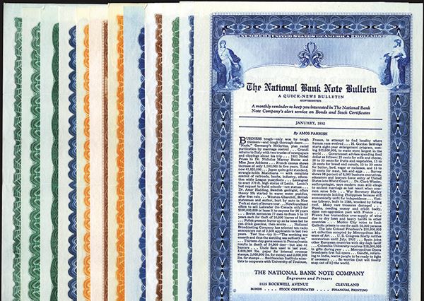 Lot of 12 Advertising sheets - news bulletins, all different. National Bank Note Bulletin, January-December 1932. Amos Parrish. Published by the National Bank Note Company, Cleveland. Letterpress text at center of large engraved border, each month a different engraved border is used in a different color. Includes extensive news and financial information from that time period in each issue. (12)