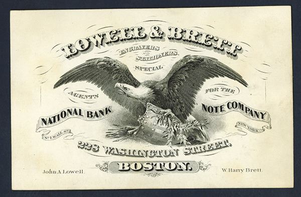 Boston, Massachusetts. ND ca.1860-70's, 5 x 3 inches, Intaglio printed in black on thin card stock, Sceaming eagle and shield in middle, Offices located at 228 Washington Street, Boston. John A Lowell eventually opened up his own printing and engraving company in Boston. XF condition with mounting remnants on back, extremely rare if not unique, First time seen by cataloger. National BNC. From a new find.