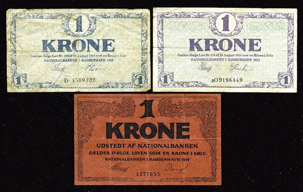 Denmark. 1 Krone. P-10b (red paper); P-12d, h. First a nice Fine, others Very Good to Fine. 3 pieces.