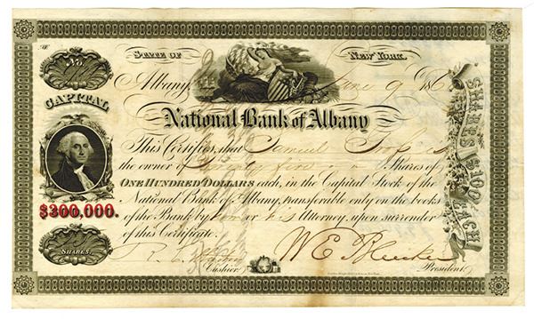 Albany NY. 25 Shares, I/U, Black with red $300,000 overprint under Washington's portrait on left where capitalization was lowered. VF. (From the collection of John E. Herzog)