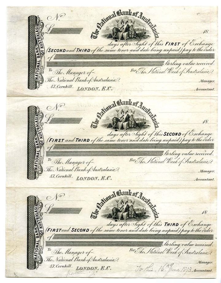 Australia, Issued in Australia and payable in London, 1873. Uncut sheet of 3 proof Bill of Exchange drafts of First, Second, and Third Exchange Payments for the National Bank of Australasia payable in London at their London branch of the bank. Approval date and signature on bottom dated June 16th, 1873. The National Bank of Australasia was a bank based in Melbourne. It was established in 1858, and in 1982 merged with the Commercial Banking Company of Sydney to form National Australia Bank.