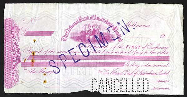 Melbourne, Australia. Bright rose, three allegorical figures and a lion, "SPECIMEN" stamped in purple, and pin cancelled. Small piece out at the bottom, some stains and staple holes, otherwise VF.