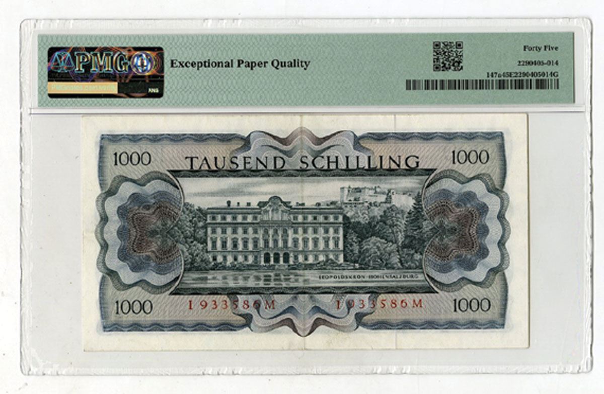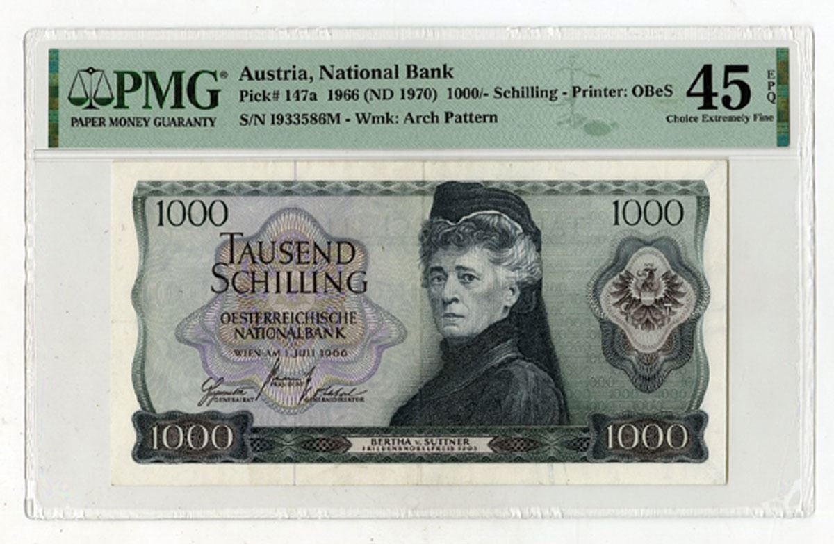 Austria, 1966 (ND 1970). 1000/- Schilling, P-147a, Issued Banknote, Blue-violet on m/c underprint with Bertha von Suttner at center with arms at right, Back is m/c with Leopoldskron Castle and Hohensalzburg Fortress, S/N I933586M, PMG graded Choice Extremely Fine 45 EPQ, OBeS.