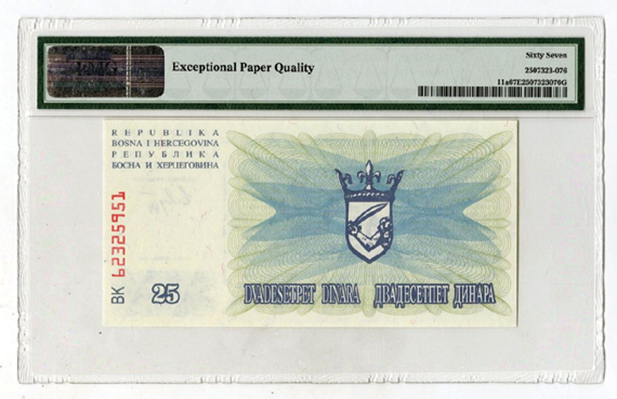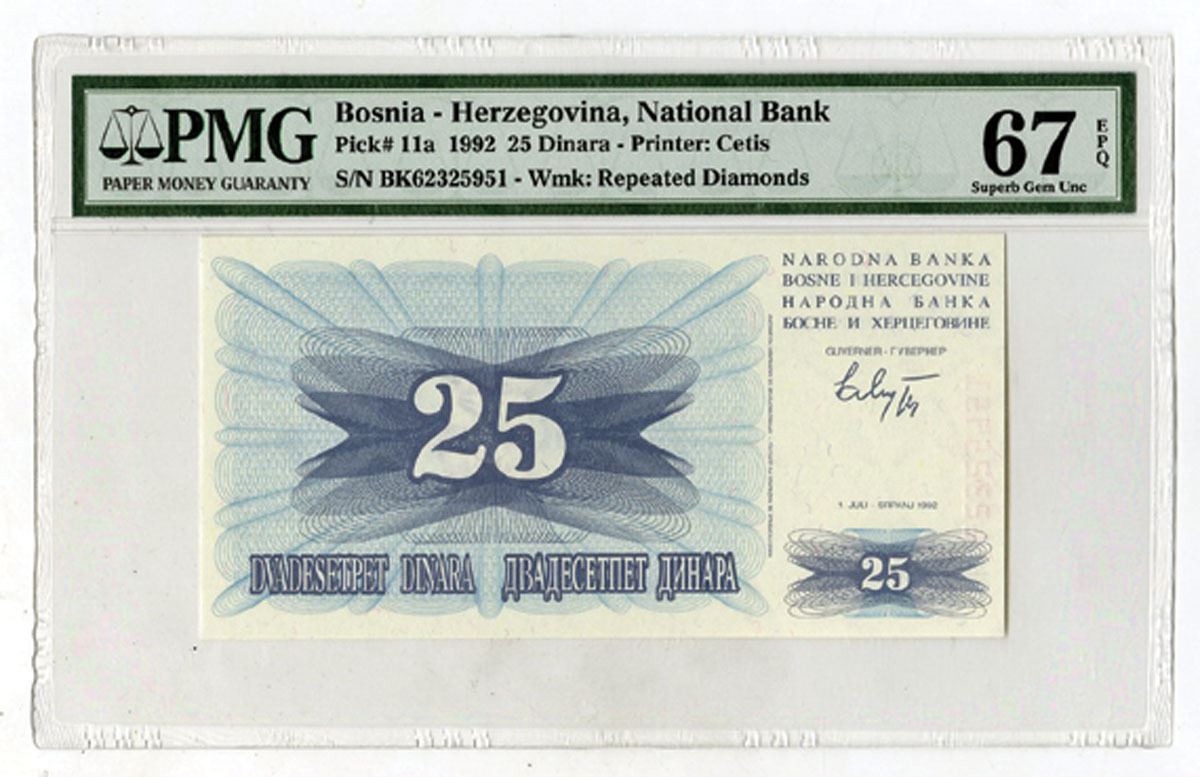 Bosnia-Herzegovina, 1992. 25 Dinara, P-11a, Issued Banknote, Dark blue on light blue underprint, S/N BK62325951, PMG graded Superb Gem Uncirculated 67 EPQ, Cetis.