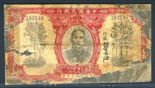 Canton, China. 1921, $10, P-516, (S/M#C261-12), Issued banknote, Red and black, blue back, Sun Yat-sen at center, S/N 102549, A very scarce issue in any form or condition. This note is missing the upper right corner, the lower right corner with a portion of the bottom margin and the left corners, mounted on front and back on thin translucent paper. First time seen by cataloger.