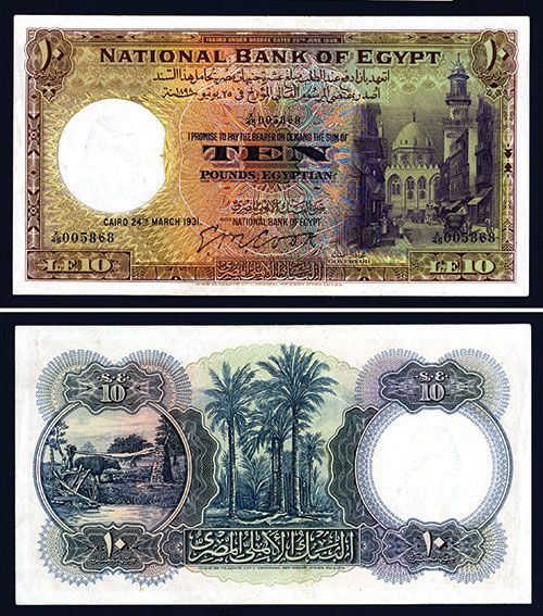 Cairo, Egypt, 24th March, 1931, 10 Pounds, P-23a, Issued banknote, Brown on m/c underprints, Cook signature, S/N X/45 005868, The note appears AU to Uncirculated but there is evidence of a light horizontal fold and additional handling light internal bends that keep this lovely note XF to Choice XF. Sharp corners, large even margins and bright colors only enhance this first issue of the series. Attractive note for any level of collector. BWC.