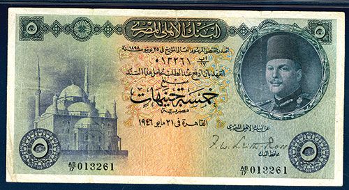 Cairo, Egypt. 1946, 5 Pounds, P-25a, Issued banknote, Blue green, violet and brown, S/N AB/17 013261, Leith-Ross Signature, PMG graded Very Fine 25 Net with notation of splits at top vertical fold margins, otherwise a very attractive example with large even margins. BWC.