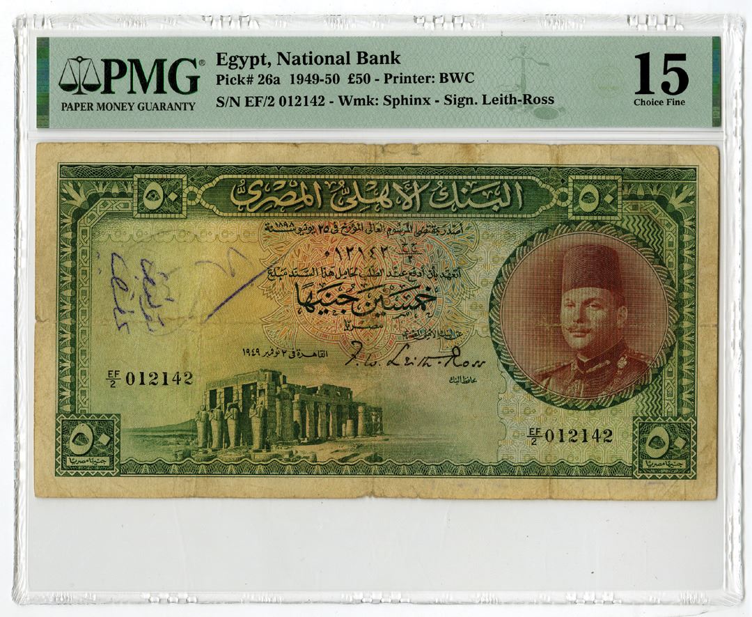 Egypt, 1949-50. 50 Pounds, P-26a, Issued Banknote, Green and brown on m/c underprint with portrait of King Farouk at right and ruins at left, Back is green with city skyline at center, S/N EF/2 012142, PMG graded Choice Fine 15 with comment "Annotations," BWC.