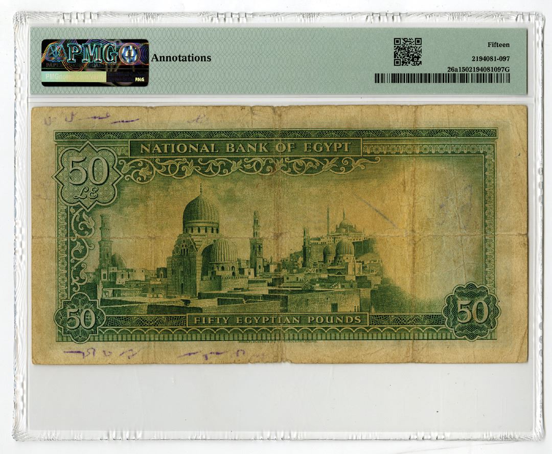 Egypt, 1949-50. 50 Pounds, P-26a, Issued Banknote, Green and brown on m/c underprint with portrait of King Farouk at right and ruins at left, Back is green with city skyline at center, S/N EF/2 012142, PMG graded Choice Fine 15 with comment "Annotations," BWC.