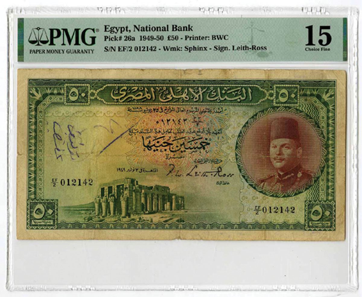 Egypt, 1949-50. 50 Pounds, P-26a, Issued Banknote, Green and brown on m/c underprint with portrait of King Farouk at right and ruins at left, Back is green with city skyline at center, S/N EF/2 012142, PMG graded Choice Fine 15 with comment "Annotations," BWC.