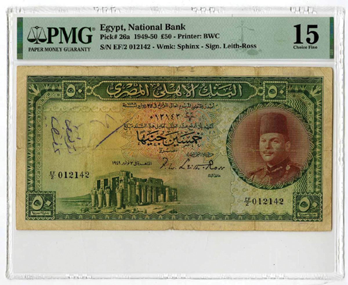 Egypt, 1949. 50 Pounds, P-26a, Issued Banknote, Green and brown on m/c underprint with portrait of King Farouk at right and ruins at left, Back is green with city skyline at center, S/N EF/2 012142, PMG graded Choice Fine 15 with comment "Annotations," BWC.