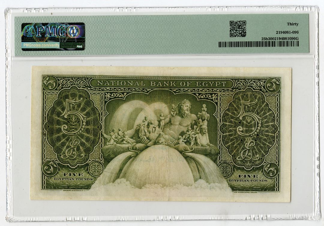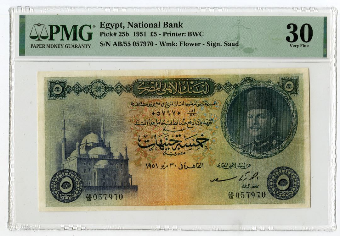 Egypt, 1951. 5 Pounds, P-25b, Issued Banknote, Blue-green with violet and brown print, Portrait of Kong Farouk at right and Citadel of Cairo at left, Back is olive with sculpture at center, S/N AB/55 057970, PMG graded Very Fine 30, BWC.