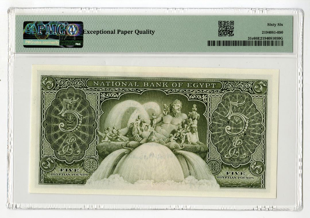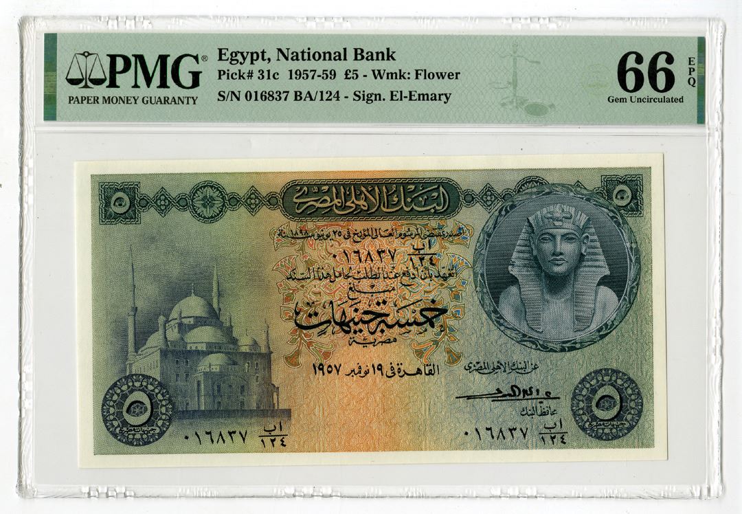 Egypt, 1957-59. 5 Pounds, P-31c, Issued Banknote, Dark green with gray-blue and brown with Tutankhamen facing at right and Mosque at left, Back is green with sculpture at center, S/N 016837 BA/124, PMG graded Gem Uncirculated 66 EPQ.
