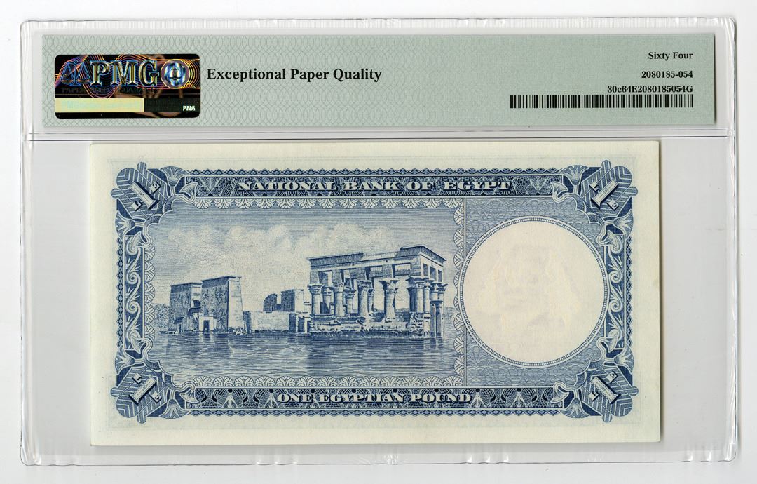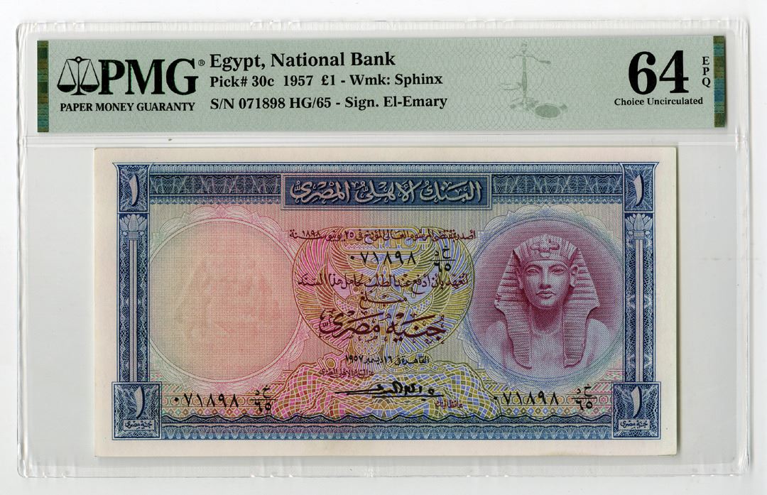 Egypt. 1957. 1 Pound, P-30c, Issued banknote, Blue on multicolor underprint, S/N 071898 HG/65, Sign. El-Emary, Watermark: Sphinx, PMG graded Choice Uncirculated 64 EPQ.