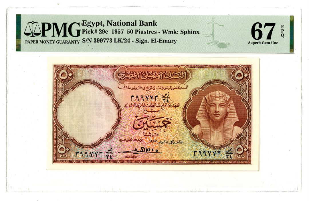 Egypt, 1957. 50 Piastres, P-29c, Issued Banknote, Brown on m/c underprint with portrait of Tutankhamen at right, S/N 399773 LK/24, PMG graded Superb Gem Uncirculated 67 EPQ. Highest graded note out of 12 graded in the PMG census.