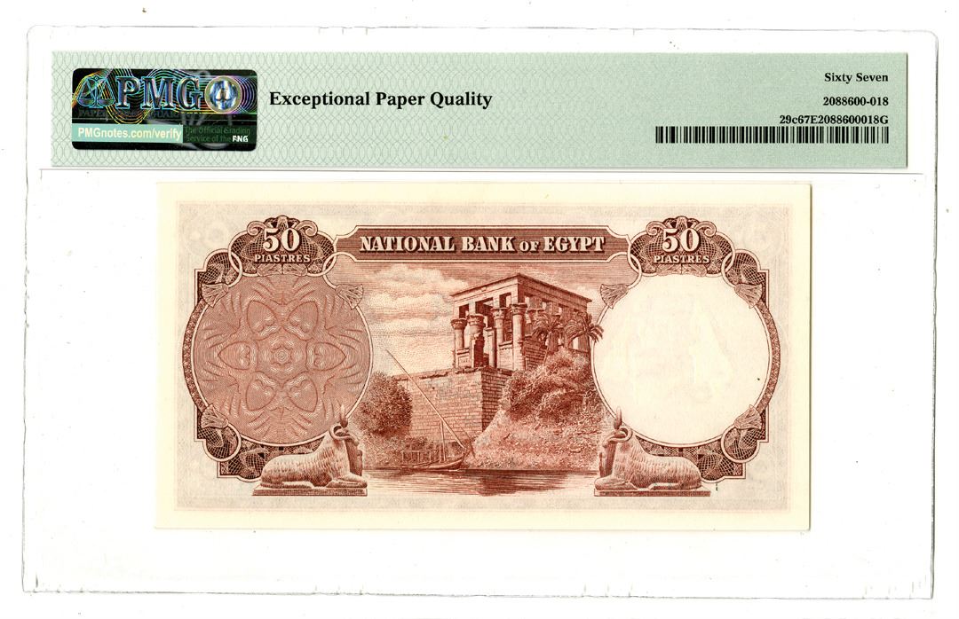 Egypt, 1957. 50 Piastres, P-29c, Issued Banknote, Brown on m/c underprint with portrait of Tutankhamen at right, S/N 399773 LK/24, PMG graded Superb Gem Uncirculated 67 EPQ. Highest graded note out of 12 graded in the PMG census.