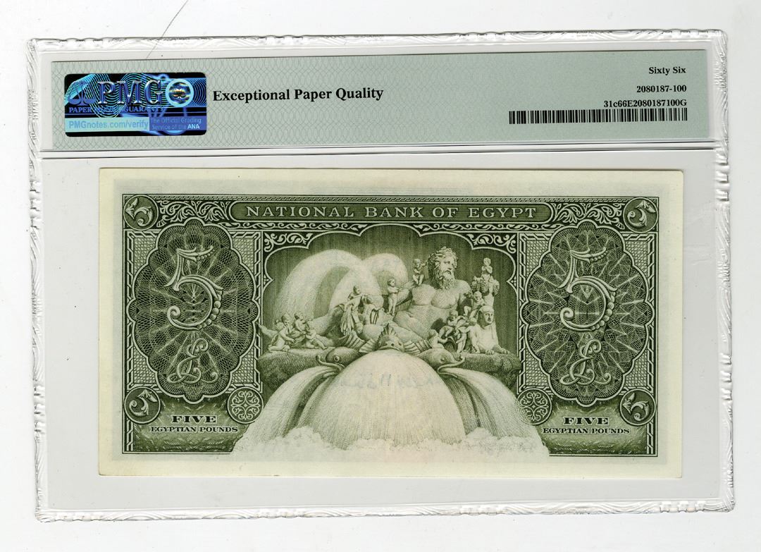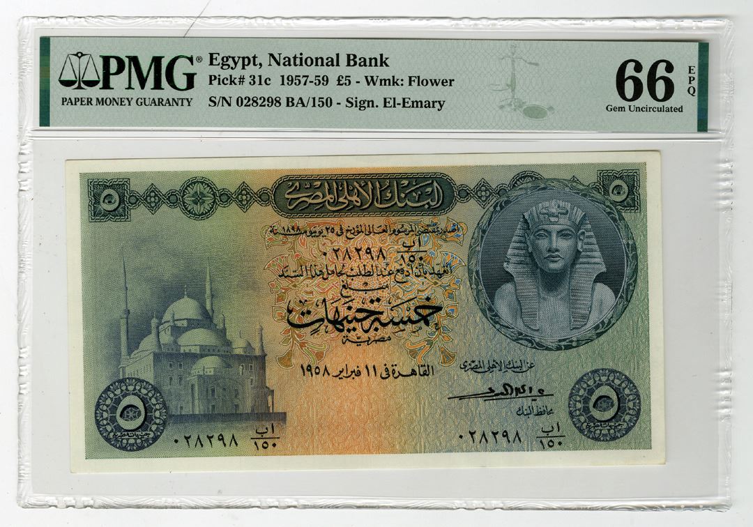 Egypt. 1958. 5 Pounds, P-31c, Issued banknote, Dark teal on multicolor underprint, S/N 028298 BA/150, Sign. El-Emary, Watermark: Flower, PMG graded Gem Uncirculated 66 EPQ.