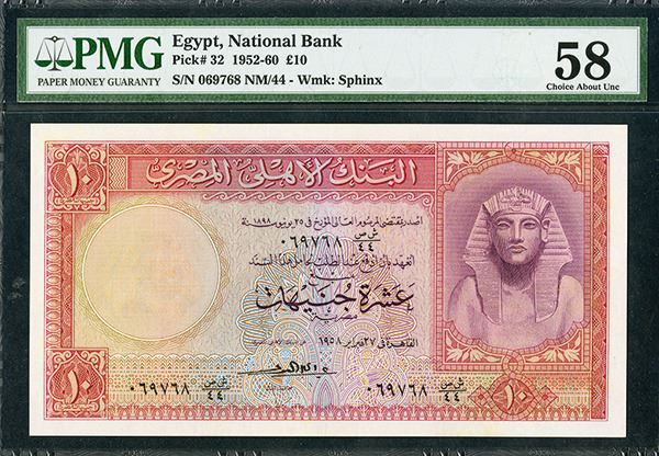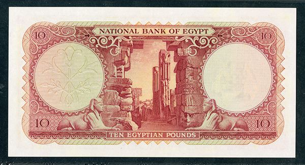 Egypt. 10 Pounds P-32 dated Feb 27, 1958. Red and purple on multicolored under print. Bust of Tutankhamen at right. Very nicely centered gorgeous Uncirculated to Gem Unc.