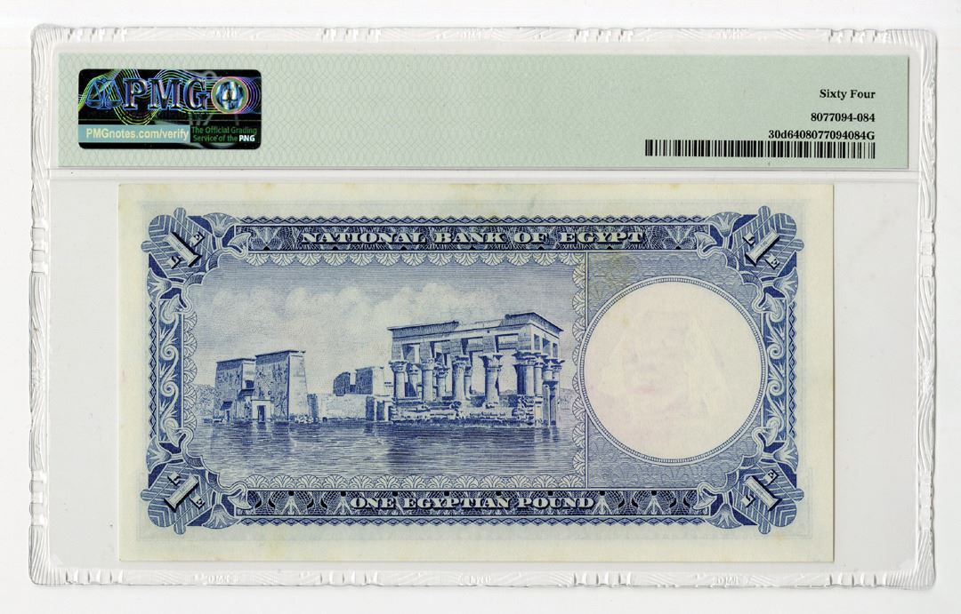 Egypt. 1960. 1 Pound, P-30d, issued banknote, Blue on m/c, El-Refay signature, back blue, PMG Graded Choice Uncirculated 64.
