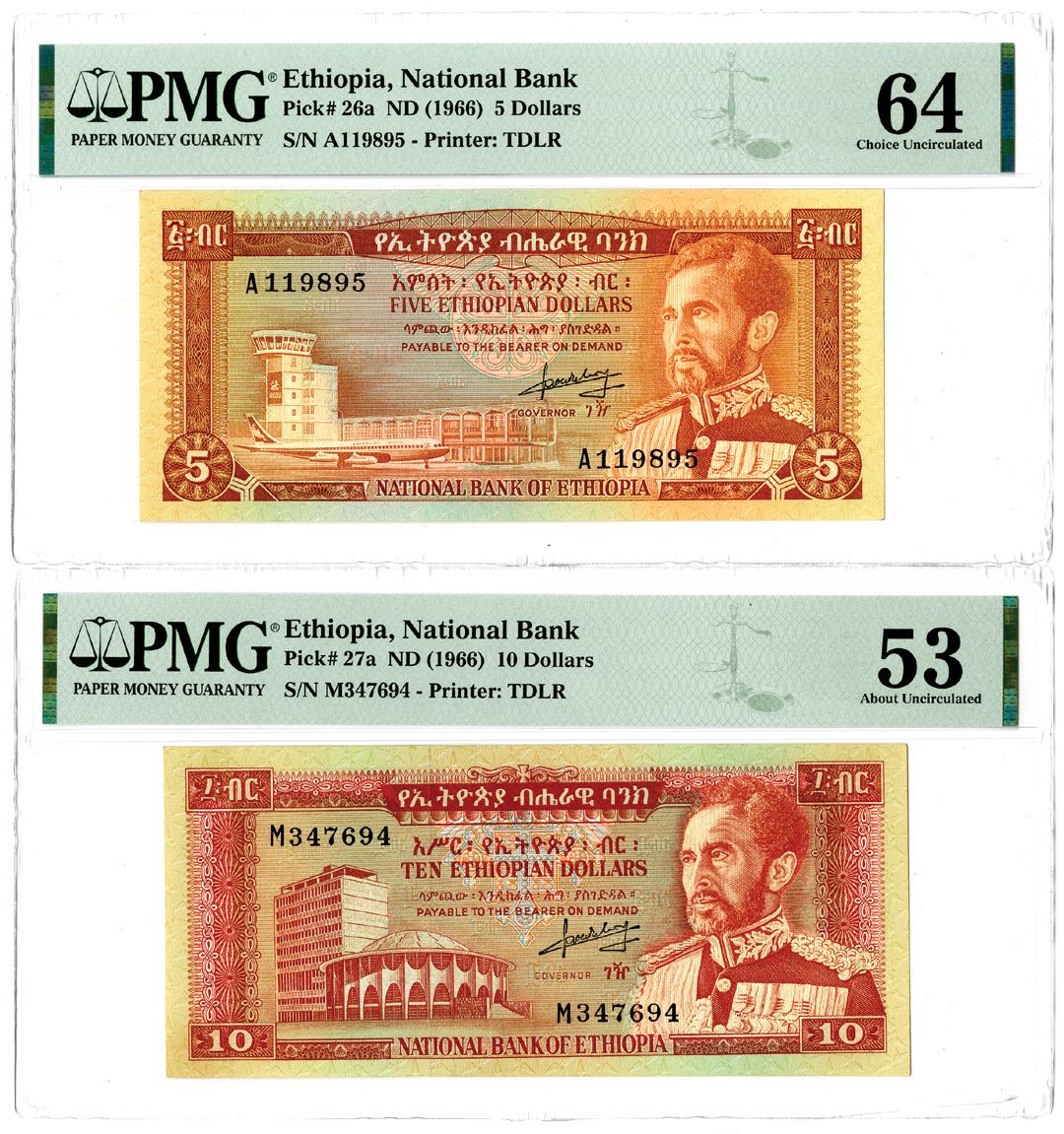Ethiopia. ND (1966). Pair of Issued Banknotes. $5, P-26a, brown on m/c underprint with Addis Ababa at left. S/N A119895 printed by TDLR. PMG graded Choice Uncirculated 64 with comment "staple holes." $10, P-27a, dark red on m/c underprint with Addis Ababa at left. S/N M347694 printed by TDLR. PMG graded About Uncirculated 53.