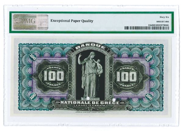 Greece, 1917, 100 Drachmai, P-53s, Specimen banknote. Black on purple and green and m/c, Specimen overprints, POC's, S/N MM00 00000, PMG graded Gem Uncirculated 66 EPQ. ABNC.