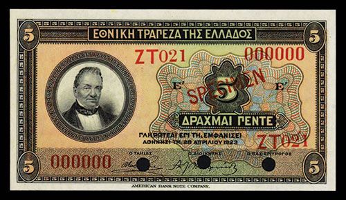 Greece, 1923, 5 Drachmai, P-73s, Specimen banknote. Black on light red and m/c undertint with portrait of Stavros on left, back with Athena. S/N ZT021 - 000000, POC's, Specimen overprints, PMG graded Gem Uncirculated 65 EPQ (Exceptional Paper Quality). Attractive note, ABNC. One of only 2 graded by PMG.