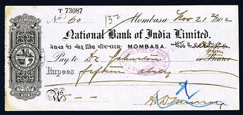 Mombasa, Kenya, 1902, Issued Check on National Bank of India Ltd., #60, Ornate left border in black print on purple paper, VF condition with minor toning along the edges. Red Queen Vic 1 Anna British East Africa stamp on verso.