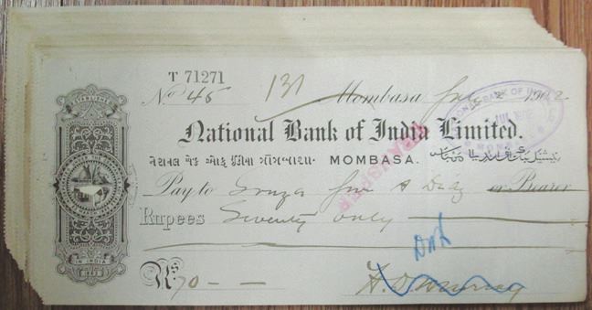 British East Africa. Lot includes over 40 pieces, all the same: I/C Checks, Black text printed on gray paper, ornate seal depicted at left margin. All have 1 Anna, BEA adhesive revenue stamps on the back with Queen Victoria's portrait, All are in VF to XF condition. Many are sequential. 40+ pieces.