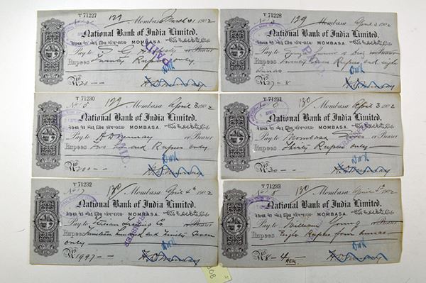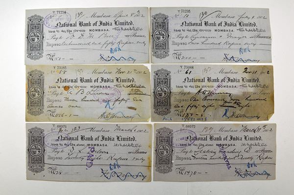 British East Africa. 1902 15 issued and cancelled checks with adhesive revenue stamps on back. Mostly Fine-Very Fine. Some with edge tone.