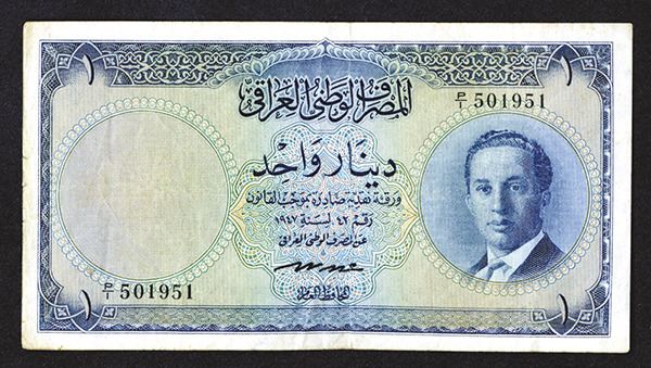 Iraq. 1 Dinar. P-34. Portrait of King Faisal at right. Equestrian statue on back. Fine-Very Fine, left edge with a bit of handling.
