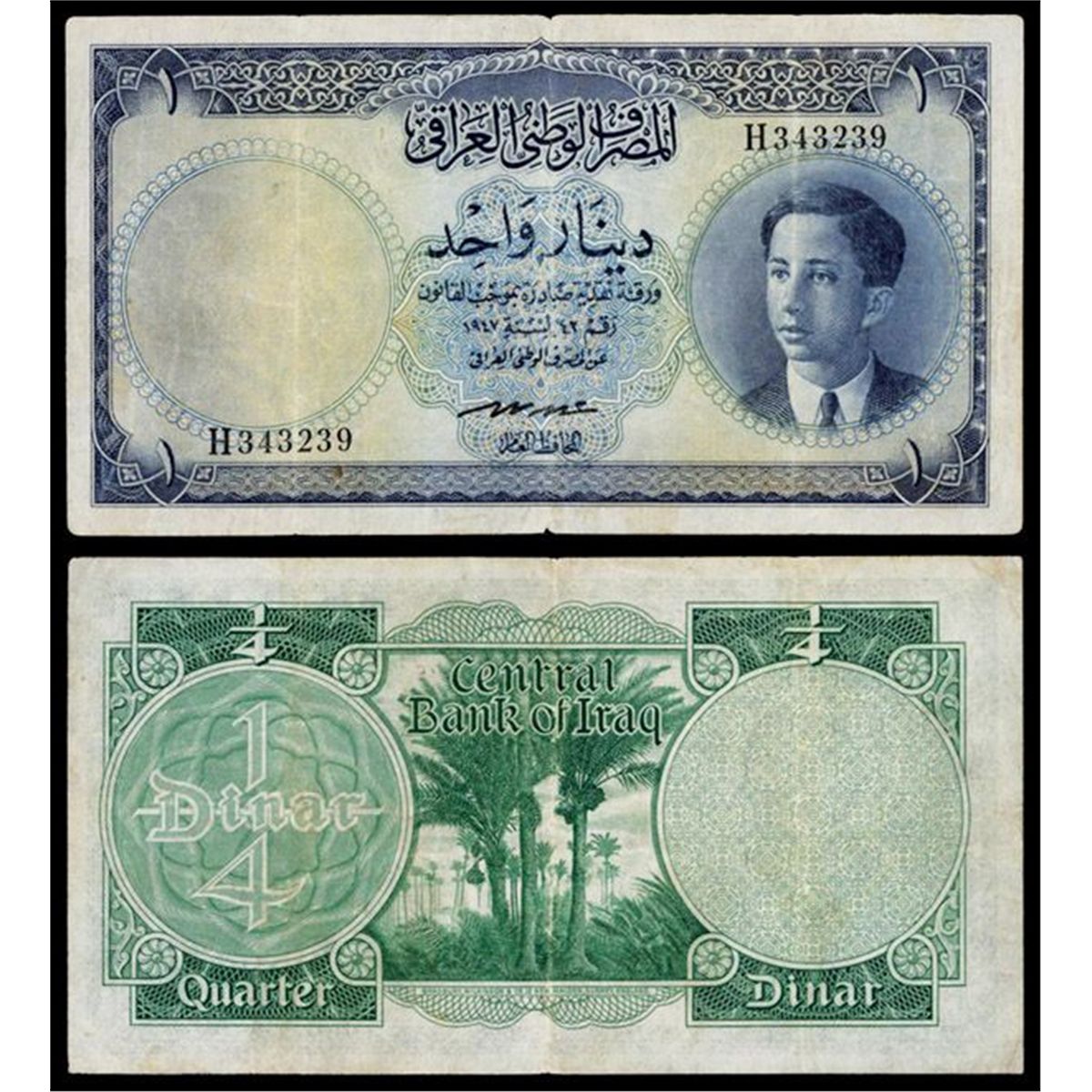 Iraq, L.1947 (1950) Second Issue, 1 Dinar, P-29, Issued banknote, Blue on m/c, King Faisal II at right, Fine to VF condition with 2 tiny notches on the top and bottom middle margins where the note was folded vertically, S/N H343239. BWC.