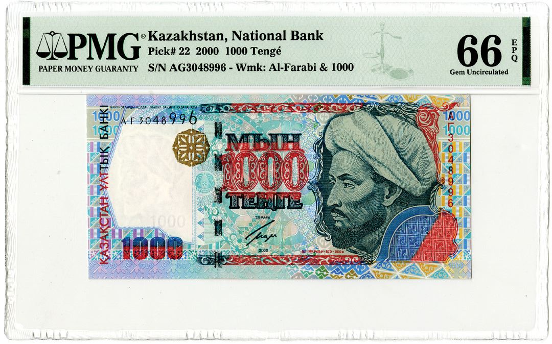 Kazakhstan. 2000. 1000 Tenge, P-22, Issued banknote, S/N AG3048996, Watermark: Al-Farabi & 1000, PMG graded Gem Uncirculated 66 EPQ.