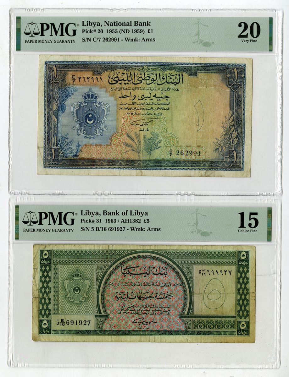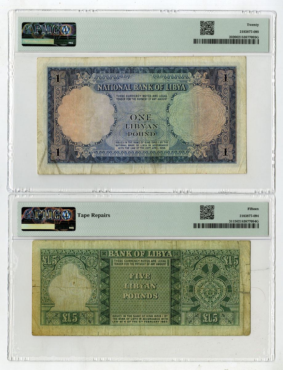 Libya, 1955 (ND 1959)-1963. Lot of 2 Issued Banknotes, Includes 1955, 1 Pound, P-20, Blue on green and orange underprint, Arms of Libya at left, S/N C/7 262991, PMG graded Very Fine 20; and, 1963, 5 Pounds, P-31, Black on green and m/c underprint, Crowned arms at left, S/N 5 B/16 691927, PMG graded Choice Fine 15 with comment "Tape Repairs." (2). Sold "AS IS" no returns accepted.