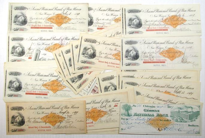 Connecticut, 1877-1900. Lot of 50+ I/U Bank Checks with revenue stamp and imprinted revenue stamps, Includes 40+, New Haven, CT., 1899, RN-X Imprinted Revenues on ABNC printed checks from the Second National Bank of New Haven ; and, an assortment of National Bank of New England I/C Checks. Checks range from VF to XF condition. ABNC. (50+). Sold "AS IS" no returns accepted.