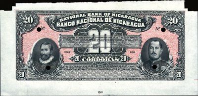 Nicaragua. National Bank of Nicaragua.1912. P-59 Unlisted. 20 Cordobas Color trial with light red under print. Unpriced in Pick. Printed on india paper. Punched out Cancels. Very rare note. Choice condition with large margins. Hamilton BNC.