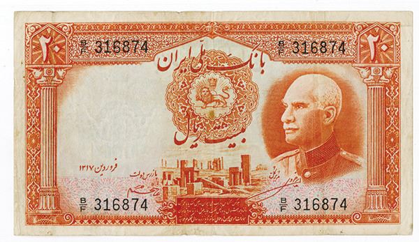 Iran. Issued 20 Rials, AH1317 (1938), P-34Aa, About Very Fine.
