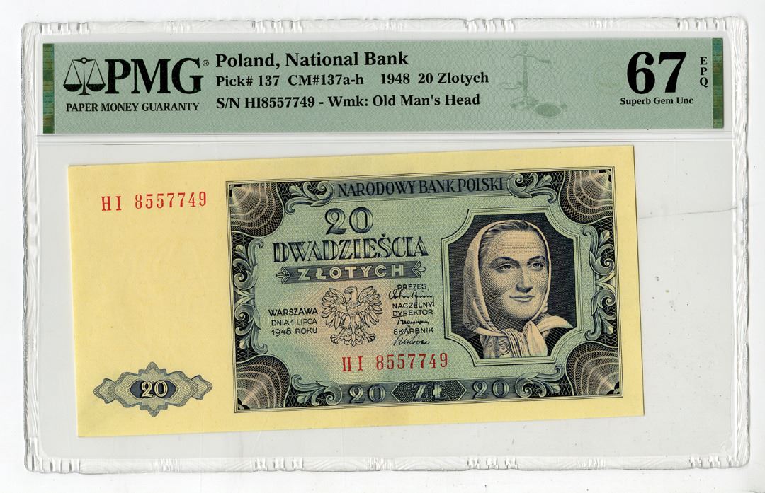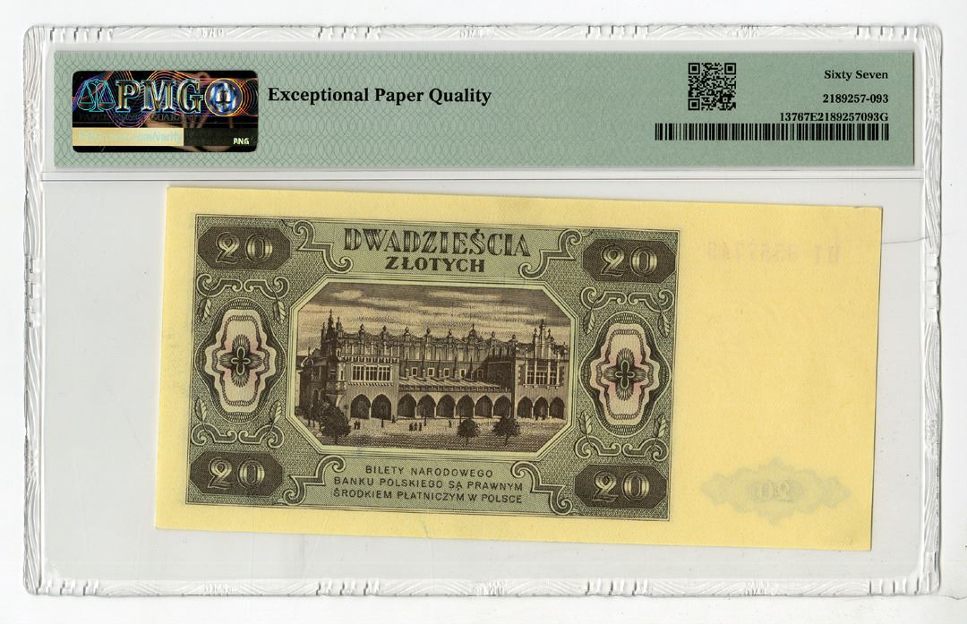Poland, 1948. 20 Zlotych, P-137, Issued Banknote, Black and dark blue on light blue and m/c underprint, Smiling woman at right, Back is dark blue on pink underprint, S/N HI8557749, PMG graded Superb Gem Uncirculated 67 EPQ.