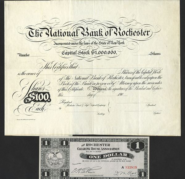Rochester, NY, Lot of 2 items, Includes National Bank of Rochester, 190x, Proof Stock certificate of text only, no underprint and 1933 I/U $1 Depression Scrip Note, VF to XF condition.