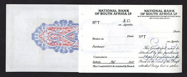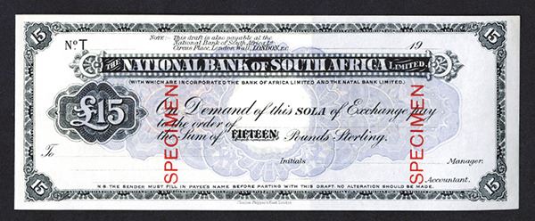 South Africa, ND (ca.1900), £15 Pounds Sterling, P-Unlisted, Specimen Sola of Exchange, Black on light blue, back m/c, National Bank of S.A., Ltd, (with which are incorporated the Bank of Africa Ltd. and the Natal Bank Ltd). Red Specimen overprints, Counterfoil on left, Choice Uncirculated condition, Charles Skipper & East London. Rare if not unique Circulating Bill of Exchange. Interesting denomination.