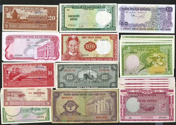 South Viet Nam. 1, 5, 10, 20, 50, 100, 200 Dong. P-1a (5); 2 (5); 3 (5); 5a; 6a; 8a; 9a (VG); 13a; 16a; 17a; 19b; 24a (2). Mostly Extremely Fine to Choice Uncirculated except where noted. 25 pieces.