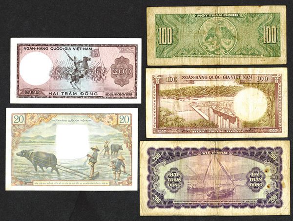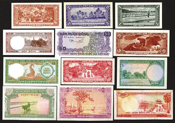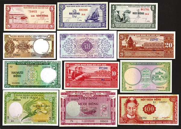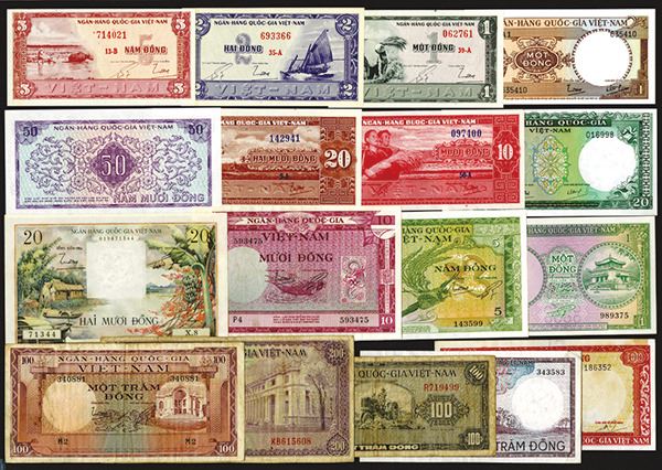 South Viet Nam. 1, 2, 5, 10, 20, 100, 200 Dong. P-1a; 2a; 3a (VF); 4a; 5a; 6a; 8a (Fine); 9a (Fine); 11a; 12a; 13a; 15a; 16a; 17a; 18a (Fine); 19a (Very Fine, stain); 20a (Very Fine). All Choice Uncirculated except where noted. 17 pieces.
