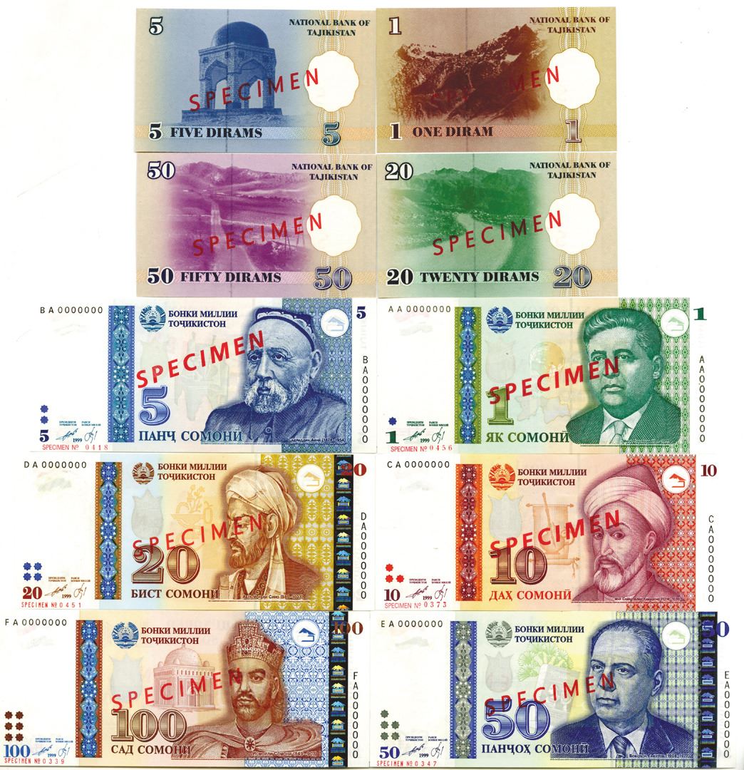 Tajikistan. Set of 1, 5, 20, 50 Dram & 1, 5, 10, 20, 50, 100 Somoni banknotes, all with SPECIMEN overprint and 0000000 serial number. P-10s; 11s; 12s; 13s; 14s; 15s; 16s; 17s; 18s; 19s. Choice to Gem Unc. (10)