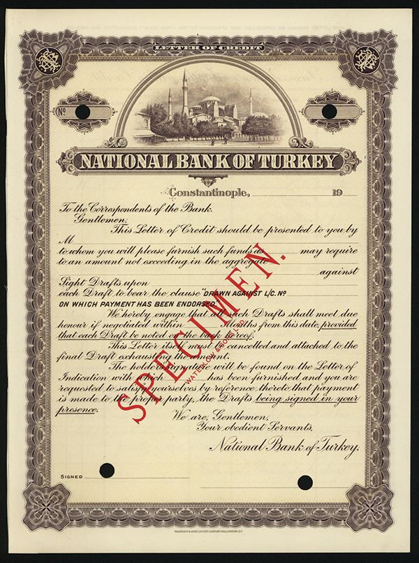 Constantinople, Turkey. 19xx (1920's). Specimen Letter of Credit (similar to an early travelers check). 3 printed pages in brown. Vignette of impressive building with minarets. Red "Specimen - Waterlow & Sons, Ltd." overprint and POC's. XF to AU condition. Rare LC fiscal item from Turkey. W&S.
