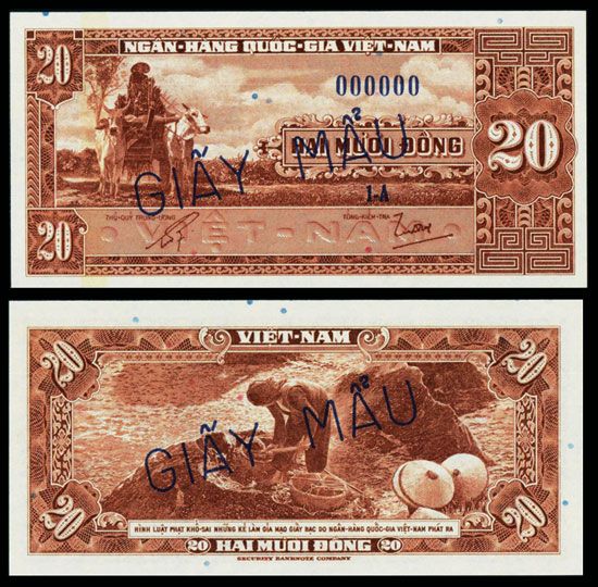 Viet Nam-South, ND (1962), 20 Dong. P-6s, specimen banknote, Brown face with ox cart on left and back with woman digging, ÒGIAY MAUÓ overprints on face and back, 00000 serial numbers. SBNC. PMG graded Ò66 Gem Uncirculated, EPQÓ. Rare note in high condition. SBNC.