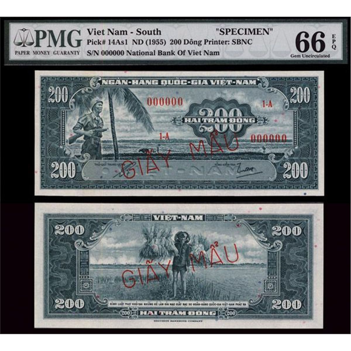 Viet Nam - South, ND (1955). 200 Dong, Ser. 1A. P-14As1, Specimen, Unissued banknote, green, soldier at left, back girl with sheaves in field. Red “Giay Mau” and “00000” serial number overprint. Intaglio printed. PMG graded “66 EPQ” Gem Uncirculated, Exceptional Paper Quality. Scarce high grade example of this attractive and rare note that was never issued. SBNC.