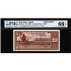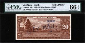 ND (1962). 20 Dong, P-6s, Specimen, brown, oxcart on left, back with woman digging. Blue "Giay Mau" and "00000" serial number overprint. PMG graded "66 EPQ" Gem Uncirculated, Exceptional Paper Quality. Scarce high grade example of this attractive note. SBNC.